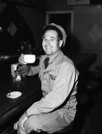 Coffee Rationing. Felton A. Folowell, truck driver, drinking coffee. Folowell is shown sitting at a bar with a cup of coffee in his hand. He is smiling widely at the camera as he enjoys his beverage. He is wearing his driver's uniform and has his legs crossed. On the bar top is a small arrangement of napkins and condiments, as well as a small saucer and spoon. Further in the background, a doorway can be seen.