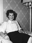 Mrs. B. D. Tonner. Mrs. Tonner is shown laughing and sitting in an arm chair. She is wearing a dark skirt with a tucked in blouse and a beaded necklace. Next to her is a standing lamp. Mrs. Tonner's husband is Ensign B. D. Tonner, who is a part of the Marine Air Corps.