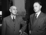 27th Annual meeting of Texas Sheep and Goat Raisers Association in San Antonio, Texas. Marsh Lea of Fort Stockton (left), vice president of the association, and H. W. Mathews with the agricultural research department of Swift & Co, Chicago. Lea and Mathews are shown conversing with each other, as Lea holds a cigar in his hand. Both are dressed in dark suits and Lea is also wearing a pair of eyeglasses. Behind them, an unnamed person can be seen looking on.