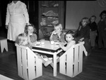 Girls Center and Day Nursery. Left to right: Round the table Mary Jeanette Hefner, Nancy Lee McDougal, Glenda Mae Gibbert and Barbara Fay Flack. The four small girls are shown sitting around a table in their day care center, enjoying a plate of cookies and glass of milk. Most of the girls are looking on at the camera, however Mary is looking away and biting a cookie. The chairs the girls are sitting in are similar to small fence posts. In the background, other children can be seen looking on. An unnamed day car worker can also be seen watching the girls.