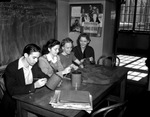 Junior Red Cross workers at Paschal High School. Left to right: Clifford Hodges, Pit Steele, Edna Carlson, Mary Katherine Boone. The group of four are shown sitting at a table knitting, sewing and painting flower containers Clifford is holding a paint brush and a can while the other three girls are working together on a quilt. On the corner of the table is a stack of paper and folders. Behind the group is a chalkboard with writing on it and on the adjacent wall a calendar hangs. The girls appear to be smiling while Clifford seems focused on painting. Published in The Fort Worth Star-Telegram Morning Edition December 6, 1942.