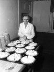 Mrs. Georgia Harris, retiring attendant of Texas Christian University (T. C. U.)'s cafeteria. Mrs. Harris is shown standing at a table cutting a slice into one of the many pies set out on the table. She is smiling and looking at the camera as she makes the cut. She is wearing a pair of eyeglasses and a long-sleeved, buttoned up jacket with a skirt. To the side of the table are stacks of plates and behind Mrs. Harris is a closed door.