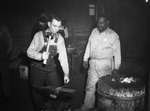 L. C. McRorey, instructor in blacksmith shop of the Negro War Industries Training School, National Defense School. McRorey is shown demonstrating to the class the method of shaping iron. He holds a large metal hammer with one hand as he hold a piece of iron to an anvil with the other. McRorey is wearing a pair of overalls with a long-sleeve shirt underneath. Beside him is an unnamed African-American who looks on. In the background other African-American men can be seen working.