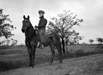 Marine Air Corps Station. Private First Class Brusenhan, 18, of Coleman, Texas on horse at the Marine Air Corps Station. "'The Cowboy Marine' is Private First Class Gene Brusenhan, 18, son of Mr. and Mrs. Brusenhan of Coleman, Texas. In the Marine Corps a year, the ranch boy has seen six months service in Hawaii, is now assigned as orderly to Colonel Lee. Marine guards patrol the base on horseback." Private First Class Brusenhan is riding a horse. The horse is looking at the camera with erect ears, as if on alert. Private first class Brusenhan is wearing muddy boots, slacks, a bomber jacket, a hat with a chin strap, and a plastic cap which appears to serve the purpose of protecting the hat from water. The horse's feet are also muddy. Grasses and trees are filling the landscape around the pair.