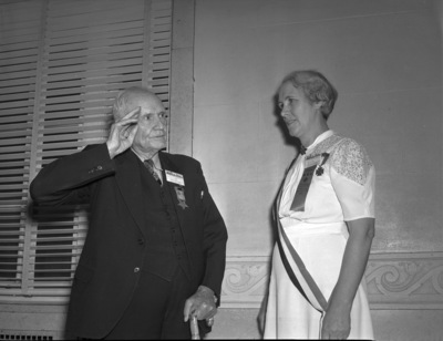 Officers were elected and installed at the final sessions of the 55th annual encampment of the Grand Army of the Republic (G. A. R.) of Texas and the auxiliary, the Woman's Relief Corps, at Hotel Texas. Among those who attended the session were John Shearer, left, of Houston, Texas, commander of the Texas Department of the G. A. R., and Mrs. Martha Porter, of Fort Worth, Texas, senior vice president of the auxiliary. They are standing in front of a window with open blinds. Mr. Shearer is wearing a suit and Mrs. Porter is wearing a dress with lace detailing on the shoulders. Mr. Shearer is holding a walking cane in his left hand and holding his right hand to his temple.