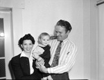 Mr. and Mrs. Tolbert Fanning and son, Michael. Mrs. Fanning is shown smiling at the camera while Mr. Fanning holds his son and smiles at him. Small Michael is also smiling and looking to the side. Mrs. Fanning is wearing a dark jacket and a blouse; Mr. Fanning is wearing a striped, long-sleeve shirt with a patterned tie; and Michael is wearing a small pair of overalls.