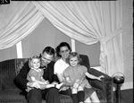 Mr. and Mrs. Lee Roy Shulk and their daughters, Betty Ann (left) and Laura Pearl. The couple are shown sitting on a dark couch with their daughters sitting on their laps. Betty Ann sits on her father's lap while Laura Pearl sits on her mother's. The small family from Oklahoma is shown smiling and laughing with each other. Mr. Shulk is wearing a dark suit and his wife is wearing a blouse and skirt with a pair of eyeglasses. Both daughters are wearing similar, small dresses. Published in The Fort Worth Star-Telegram Evening Edition December 8, 1942.