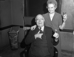 Mr. and Mrs. James R. Record are pictured in an office at the Fort Worth Star-Telegram. Mr. Record is the managing editor of the Star-Telegram. He is leaning back in an office chair. He is dressed in a three-piece suit. Mrs. Record is standing behind her husband's chair. She is wearing a dress with buttons along the top and a hat. Both husband and wife are holding a small metal cylinder. A waste basket is in the corner of the office, overflowing with trash.