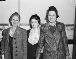 The Block Mothers is a local organization with 10,000 members. They are putting plans into motion to organize their neighborhoods before additional rationing programs go into effect. The first step of the plan involved electing colonels to lead the chapter. Standing against a wall, left to right, are Mrs. C. H. Wimberly, Mrs. E. E. Aldridge, and Mrs. Newton Wallace. Mrs. Wimberly is a member of the Woman's Club and the First Methodist Church. She is wearing a hat, dress, and a striped coat. Mrs. Aldridge is colonel for the McLean Carroll, Carlson and Clayton area. She is wearing a hat and a dress with a frilly collar. Mrs. Wallace is colonel for a section covering eleven schools. She is dressed in a hat and a fur coat.