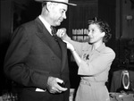 Texas Sheep and Goat Raisers Association. Governor Coke R. Stevenson shown as Miss Metha Thompson pins on a badge to his suit. Miss Thompson is looking up happily at Stevenson as she pins on the badge for the meeting onto his suit lapel. Miss Thompson is wearing a belted dress and Stevenson is also wearing a brimmed hat and holding a smoking pipe. Behind them, a table can be seen.
