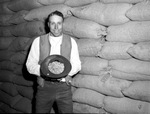 Peanuts. Robert Whitehead shown with hat-full of peanuts. Whitehead is shown standing in front of a large amount of sacked peanuts, holding a hat filled with peanuts in his hands. He is smiling at the camera and is wearing a vest with a long-sleeve shirt underneath.