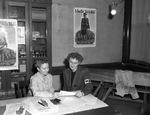 The Women's Army Auxiliary Corps (W. A. A. C.) is recruiting for volunteers at the Army Recruiting Office in Fort Worth, Texas. Sitting at a table, left to right, are Miss Frances Blocker and Miss Cleo B. McClure. Miss Blocker is running through the physical and mental tests given to new recruits. She is wearing a stripped button-up blouse. Miss McClure is a W. A. A. C. volunteer. She is dressed in her uniform. Hanging on the walls are posters promoting enlistment in W. A. A. C.