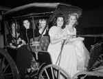 Five women are making their way to the United Service Organization (U. S. O.) formal dance by buggy. Holding the reins is Jeanie Gracey. Next to her is Frances Ann Miller (right). On the back seat are, left to right, Miss Dorothy Kassel, Miss Bobbie Billingsley and Miss Marguerite Kirchman. Miss Gracey is wearing a light-colored, floor-length dress, a necklace, a bracelet on her left wrist and a watch on her right wrist. Miss Miller is wearing a light-colored, sleeveless dress with shoulder straps and a bracelet on her right wrist. She has a flower pinned to her hair, on the left side of her head. Miss Kassel is wearing a dark-colored dress with a contrasting color collar and a sash with a bow around the waist. Miss Billingsley is wearing a dress and a fur coat. Miss Kirchman is wearing a dark-colored dress and has a flower pinned to her hair on the right side of her head.