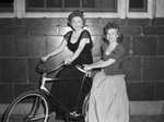Miss Addeleen Wallace (left) and Miss June Miller are making their way to the Untied Service Organization (U. S. O.) formal dance by sharing a bicycle. Miss Wallace is wearing a dark-colored dress with lace sleeves. She is holding on to the bike handles. Miss Miller is wearing a dress; the bodice and skirt are different colors. She is holding on to the bike seat.