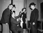 Bosses in uniform and on the program were innovations at the Beta Alpha Rho Bosses' Banquet Tuesday night. Shown are Beta Alpha Rho Bosses' Banquet attendees Renerick Clark (seated), (left to right) are Major W. E. Gebhardt, Miss Irene Humphrey, Miss Ruth Register and James R. Ellis. The group is shown gathered around Mr. Clark as he performs a magic trick with a handkerchief. Major Gebhardt winks and smiles at the camera while Miss Humphrey smiles behind him. The other two are looking on at the magic trick. Major Gebhardt is wearing military uniform, the other two men are wearing suits and the ladies are wearing dark dresses. Published in The Fort Worth Star-Telegram Evening Edition July 09, 1942.