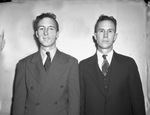United States Navy recruits Reverend G. G. Burnett, 39, right, and his son, William, 17, both of Decatur, Texas, enlisted in Fort Worth, Texas, for "general service." William is wearing a pinstripe, double-breasted suit. Reverend Burnett is wearing a three-piece suit. The recruits are standing against a bare wall.