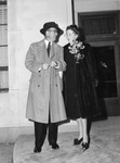 Mr. and Mrs. Robert F. Windfohr. She is the former Mrs. Anne Valliant Burnett Hall. The couple is shown standing outside of a building, smiling and looking at each other. Mr. WIndfohr is wearing a long trench coat, a pair of thick rimmed eyeglasses and a brimmed hat. Mrs. Windfohr is wearing a fur coat with an adornment of flowers around her collar and some netting that covers her forehead.