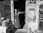 Mrs. George Bedo standing in her doorway. For 13 years, Mrs. Bedo and her husband had their home among the trees of the Trinity bottom, near Paddock Viaduct. At 68 they are having to take "rainy day" savings, and move their home, plank by plank, to another place due to a war plant nearby. Mrs. Bedo is mother of three sons in service, one son in the Navy and two in the Army. In this picture, Mrs. Bedo is wearing a long-sleeve sweater over a long, dotted dress. Her left hand is holding the wooden door open as her right side leans on the other side of the door frame. Outside her door are various buckets, pieces of gravel and rocks scattered about. Published in the Fort Worth Star-Telegram morning edition, December 11, 1942.