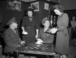 United Services Organization (U. S. O.); Shields, James A. (Pvt.); Levinson, Charles (Mrs.); Fowlkes, Preston (Mrs.); Santa Fe Station; Santa Fe Railway; Dresses; Coffee Cups; Cigarettes; Military personnel; Military uniforms; Necklaces; Jaycee Ettes; Dorman, Donald (Pvt.)