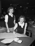 Jeanne (left) and Joan Loomis, stenographers at Quartermaster's Depot. Joan is shown sitting at desk with her sister Jeanne standing beside here. Both are smiling at the camera, as Joan writes in a large book. Both are wearing sweater vests with blouses underneath them and patterned skirts. The girls are 17 and have graduated from Anadarko High School, where they shared musical and dramatic interests. Behind them, other desks can be seen, as well as a few men working.