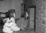Left to right are the three daughters of Lieutenant and Mrs. Anson P. Morris, Linda (three years old), Marilyn (five years old), and Annette (seven years old). The girls are inspecting their fireplace as they prepare for a visit from Santa Claus. They are dressed in their pajamas.