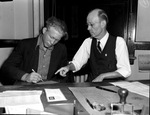 Johnny Brackett Langford, 18 year old Selective Service registrant, signing up with W. E. Crotty (right). Two men are shown seated as Mr. Langford is signing a small document while Mr. Crotty points to where he should sign. In front of them, there is a table with a variety of documents and a few pens. Mr. Langford is wearing a dark jacket with a buttoned-up shirt underneath and Mr. Crotty is wearing a suit vest with a long-sleeve shirt underneath and a pair of eyeglasses. Behind them is a closed window. Mr. Langford became Tarrant County's first Selective Service registrant. Published in The Fort Worth Star-Telegram evening edition, December 11, 1942.