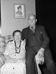 Mr. and Mrs. M. H. V. Yates, celebrating their 59th Wedding anniversary. Mrs. Yates is shown sitting in an arm-chair while Mr. Yates sits beside her on the arm of the chair. Both are smiling at the camera with Mr. Yates wrapping his arm around his wife's shoulders. Mrs. Yates is wearing a long, buttoned dress with a beaded necklaces and Mr. Yates is wearing a dark suit. The couple married in 1883 and have a daughter, Mrs. O. C. Whitaker, together. Behind them is a wall with a framed picture hanging on it.