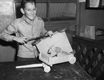 Removing the rough spots from this toy wagon, Ralph Bedford, 13, son of Mr. and Mrs. W. C. Bedford, one of the 200 members of the Fort Worth Boys' Club is engaged in the club's annual Christmas toy project. In the woodwork shop. the boys build toys of all sizes and shapes and renovate old ones for their smaller brothers and sisters. Ralph is working on a wooden wagon. There are two other wooden toys on the work table in front of him: a wagon and an elephant on wheels. Published in the Fort Worth Star-Telegram morning edition, December 15, 1942.