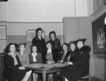 The Block Mothers is a local organization with 10,000 members. They are putting plans into motion to organize their neighborhoods before additional rationing programs go into effect. Leaders for the North Side, the largest area in the Fort Worth, Texas, are shown gathering around a table. The colonels, standing, left to right, are Mrs. Virgil Aston and Mrs. L. N. Million. Majors seated, left to right, are Mrs. R. D. Maloney, Mrs. Jeptha Craig, Mrs. Marvin Richardson, Mrs. Hugh Quinn, Mrs. Jerry W. Ralls, Mrs. J. E. Nelson and Mrs. Hugh N. Follin. Mrs. Aston is wearing a buttoned coat and a hat. Mrs. Million is wearing a dark dress, a hat and a fur scarf. Mrs. Maloney and Mrs. Craig are wearing blazers, blouses, skirts and hats. Mrs. Richardson is wearing a checkered coat and skirt. Mrs. Quinn is wearing a coat, hat, eyeglasses and a floral print dress. Mrs. Ralls is wearing a dress and a coat. Mrs. Nelson is wearing a dress and a fur coat. Mrs. Follin is wearing a hat, eyeglasses, a dark dress and a fur scarf.