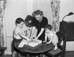 The Berg family is getting into the Christmas spirit by wrapping presents to put under the tree. Mrs. Theodore Berg is tying a bow around a present for her husband while their young children, Teddy and Janice, assist. They are gathered around a table. Lieutenant Berg is stationed at the Quartermaster Depot in Fort Worth, Texas. Mrs. Berg is wearing a dark, button-up dress. Teddy is dressed in a button-up shirt and shorts. Janice is wearing a pinafore dress and is standing on a chair.