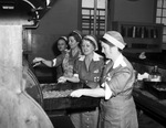 Red Cross. Disaster Dinner. Left to right, Mrs. Aaron Gernsbacher, Mrs. Porter Newman and Mrs. C. George Benzon broiling meat balls.