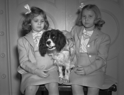 Onah Astin Barwise, right, and her sister, Betty Ann, daughters of Mr. and Mrs. Seth Barwise, shown with "Saxet Happy," cocker spaniel. Onah Astin Barwise will exhibit her cocker spaniel puppy, in the children's handling classes at the Spring Specialty Show in Pioneer Palace.