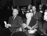 Texas Wesleyan College (T. W. C.) is holding a special commencement for those serving in the armed forces. In attendance at the graduation are Mr. and Mrs. R. G. Piper of San Antonio, Texas. They are long-time friends of the college. Mrs. Piper wrote the words and melody for "Prayer for Peace," a song delivered during the ceremonies. She is wearing a hat, blouse, fur shawl and gloves, and her eyeglasses are hanging off a chain around her neck. Mr. Piper is dressed in a three-piece suit. Sitting beside and behind Mr. and Mrs. Piper are other attendees at the ceremony.