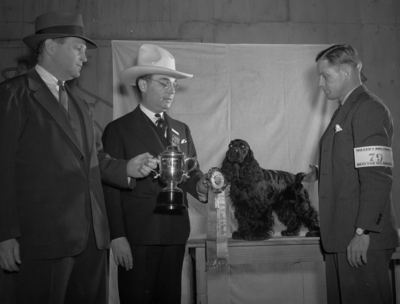 In the champion's circle at the close of the Spring Specialty Show at Pioneer Palace was Champion Stockdale Top High, black cocker spaniel owned by Veazey Rainwater Junior, stands alert while Garland Ellis, left, hands J. C. Watson, the winner's trophy. Standing between them is Dr. Lewis Hart Marks, Paoli, Pennsylvania.