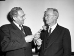 Reverend E. L. Carnett, left, is presenting Doctor W. W. Barnes with a gavel carved from an oak tree that stood in a field where the battle of Mansfield, Louisiana, was fought. Under that tree the founder of the Baptist Seminary, B. H. Carroll, was wounded 78 years earlier in the Civil War. Reverend Carnett is dressed in a suit. Dr. Barnes is a professor of church history at the Southwestern Baptist Theological Seminary. He is wearing a three-piece suit.