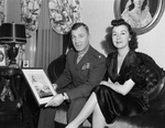 Colonel and Mrs. V. M. Guymon are looking forward to spending Christmas together as a family. The couple is shown admiring a photograph of their 18-month-old son, Vernon Melvin Junior. Vernon Jr. travel from Kingsville, Texas, to spend Christmas in Fort Worth, Texas, with his parents. Colonel Guymon is dressed in his military uniform. Mrs. Guymon is wearing a dark dress. They are sitting on a couch.