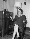 Mrs. O. P Wycoff is reclining in a rocking chair and tuning the radio to a particular station. She is wearing a dress with a lace collar and a pearl necklace. The clock atop the radio console reads quarter-til-three.
