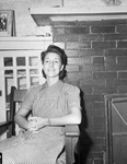 Mr. and Mrs. Hugh Baker and their six-year-old son, Don Glendon, recently moved to Fort Worth, Texas. They have spent the last 13 years in Lubbock, Texas. Mr. Baker is employed at the Consolidated Aircraft Corporation in the nose fuselage department. Mrs. Baker is spending her time house hunting for the family. They are currently living in an apartment and are searching for a permanent home. Mrs. Baker is shown sitting on a rocking chair by the fireplace. She is wearing a checkered dress.