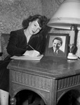 Mrs. Edwin M. Martin is a new resident of Fort Worth, Texas. She made the move from Hollywood, California, while her husband stayed back. The couple frequently exchange letters. Mrs. Martin is shown writing on a notepad, next to a photograph of her husband. She is wearing a corduroy dress.