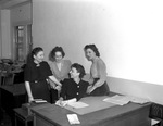 The general office of the Worth Food Market was robbed Thursday morning by three gunmen. One waited in the car, the second stood guard in the reception area, and the third carried out the robbery. Witnesses to the incident, left to right, were Mrs. Henry Wolf, Miss Josephine O'Connor, Miss Doris Stingily, and Miss Pauline Stafford. All four women are clerks at the office. They were sitting at their desks when the robber pulled his gun. He filled a flour sack with money and records from the 14 stores.