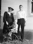 Mrs. Max Touchon and her eight children are new residents of Fort Worth, Texas. The family is coming from San Saba, Texas. Standing in front of their new home are Mrs. Touchon, Andre (15 years old), and Eugene (five years old). Mrs. Touchon is wearing a hat and a dress with a lace collar. Andre is dressed in a button-up shirt and trousers. Eugene is riding a tricycle, dressed in a striped shirt and trousers.