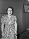 Mrs. L. B. Carpenter recently moved to Fort Worth, Texas, with her husband. Mr. Carpenter is doing construction work at the Marine Corps Air Station. The couple is originally from Wolvertown, Minnesota. They moved to Texas two years ago in their trailer house. Minnesota winters made living in a trailer too difficult Mrs. Carpenter prefers life in a regular house but enjoys traveling with her husband. She occupies herself sewing or making quilts. Mrs. Carpenter is standing outside of their home. She is wearing a floral, button-up dress and eyeglasses.