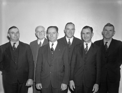 Soil conservation enthusiasts from Cooke County, Texas, who were in Fort Worth, Texas, for a conference with C. V. Marshall (not pictured), of Temple, Texas, director of the State Soil Conservation Board. The conference attendees were, left to right, Howard Springer, of Gainesville, Texas, W. S. Whaley, of Fort Worth, Texas, J. M. Weinzapfel, of Muenster, Texas, A. S. Brient, Cooke County agricultural agent, Cliff McMahon, secretary of the Gainesville Chamber of Commerce, and J. B. Klement, of Muenster, Texas. The men are standing in front of a blank wall, all wearing suits.