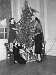 100 student officers from Tarrant Field will be guests of honor at Fort Worth Advertising Club's Christmas party at Hotel Texas. Four women, Santa's helpers are pictured here who are decorating the Christmas tree to aid in the big job of filling stockings for the honoring men in uniform who are farthest from home during the holidays. They are, from left to right, Miss Charlotte Collier, Mrs. Rowland Broiles, Mrs. J. A. Campbell and Mrs. Roy Tomlinson. All are wearing dresses. Published in the Fort Worth Star-Telegram morning edition, December 22, 1942.