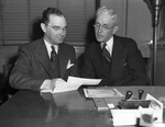 Buys bonds for his firm. Another Victory Fund Drive bond purchaser is Malvern Marks, left, manager of the Fort Worth office of the Indianapolis Life Insurance Company, who is showing buying $50,000 in the Government obligations from John H. Erikson, vice-president of Continental National Bank. The purchase brings the company's total to $775,000. The duo is shown sitting a a desk together, both looking over a bond document. The men are dressed in dark suits and small, rounded eyeglasses. Mr. Erikson has his mouth open, as if he was in the middle of speaking. On the desk there are a variety of office supplies, such as a stack of envelopes and a stamp. Published in The Fort Worth Star-Telegram Evening Edition December 22, 1942.