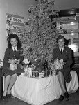 Miss Bobie Billingsley, left, and Mrs. F. Edgar Deen Junior putting the finishing touches on some unwrapped Christmas packages at the United Service Organization (U. S. O.) center at Bowen Bus Station, where hundreds of similar packages are being distributed to servicemen away from home at the holiday season. Miss Billinglsey and Mrs. Deen are wearing American Red Cross uniforms. They are sitting on either side of a Christmas tree, and are each holding a gift. More presents are stacked beneath the tree.