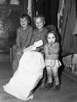 Goodfellows. Three little poverty striken kids shown with Goodfellow sack. The twins, Tommy and Johnny, are shown smiling at the camera while their younger sister, Beverly, just looks on. Both boys are wearing striped pajamas and small Beverly is wearing a striped, long-sleeve shirt and a pair of shorts with small boots. Tommy holds the sack of toys in anticipation. The twins are seven years old and Beverly is two on Christmas.