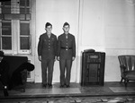 Members of the United States Armed Forces are spending their Christmas holiday in Fort Worth, Texas. Pictured at the Texas and Pacific Railway Station, left to right, are Corporal Jack Stanton and Private Gilbert Higbee. Corporal Stanton is a native of Chicago, Illinois. Private Higbee is from Pasadena, California. Both men are serving with the United States Army. They are dressed in their military uniforms.