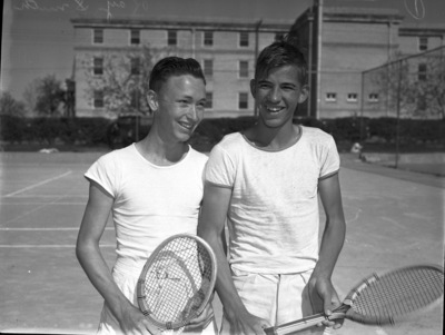 Ray Smith, left, and Cecil Martin, Denton High School students and tennis players. They are standing on the tennis court, both wearing t-shirts and trousers and holding tennis rackets.