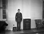 Members of the United States Armed Forces are spending their Christmas holiday in Fort Worth, Texas. Private First Class Vernon D. Hillmeyer is a soldier in the United States Marine Corps. The Havana, Illinois, native is pictured at the Texas and Pacific Railway Station. He is shown standing next to a radio, dressed in his military uniform.